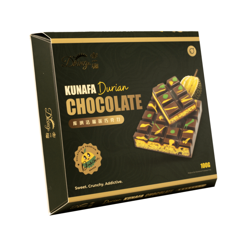 Each piece is crafted with authentic kunafa pastry dough, shredded and baked to create a crispy layer inside the chocolate. The golden crunch blends perfectly with smooth, high quality chocolate and tasty durian, giving you a unique mouthfeel in every bite.
